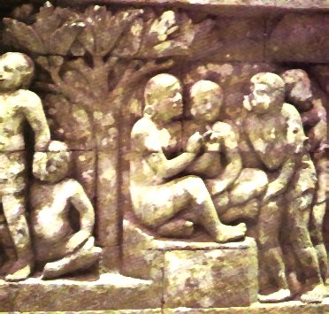 Two theories have developed about the origin of this wall. one is of a constructional nature; As saveral of the 160 hidden reliefs were found unfinished, this theory maintains that, even before the termination of the construction work, the entire monument threatened to collapse and a supporting wall was quickly built around the base of the temple. It was found that the site on which the temple is constructed not only consists of a natural hill but also of filled up earth which. The second theory favours a religious interpretation and presupposes that the massive stone wall had been planned right from the start. The Candi Borobudur was not meant to serve the religious society in general but only a chosen group of monks, who were expected to renounce all human desire in order to reach the sphere of deliverance a,d enligtenment. The theory concludes that on the one hand the sphere of desire had to be depicted, on the other hand, however, it had to be hidden from the eyes of the monks.